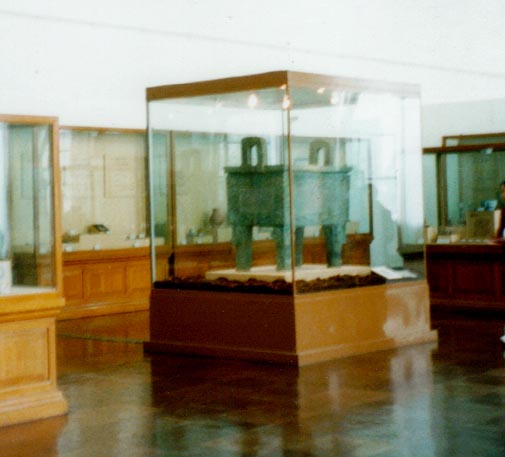 司母戊鼎 1939年河南省安陽市武官村出土 高さ133p 口の長さ 110p 口の幅 79p 重さ832.84kg。 いままで中国で発見された中で最も重い古代青銅器です武官村西北崗の王陵地域で盗掘によって発見されました。しかし、あまりにも大きくて重いため、掘り出しきれず、1946年に再発掘して南京博物館に納められました。現在はここ中国歴史博物館にあります。 銘文は「司母戊(シボボ)」と読むのが一般的ですが、解釈はいろいろあって確定していません。「戊」は廟号かと思われます。「司」については、これを女性の姓と見る説、「祠」(まつる)と見る説などがあります。 |