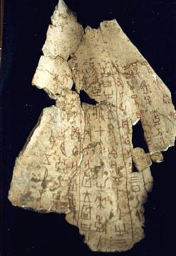 ![]() 「祭祀狩猟」朱塗刻辞 河南省安陽市出土 長さ30.8p 幅19p |