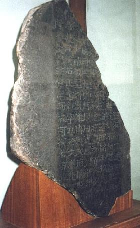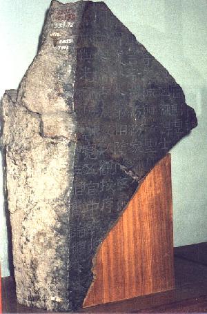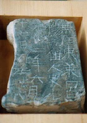 「熹平石経」残石 高さ45p 石経とは石に刻した経典のことで、儒家・道家・仏家の3種類があります。しかし、単に石経というときは、専ら儒家の経典をいいます。 儒家の経典の刻石では「熹平石経」が最も古く、次が魏の「正始石経」、唐の「開成石経(西安碑林)」と続き、その大部分が官刻です。 「熹平石経」は、当時経典の文句が乱れていたことから、定本を作る目的で刻されました。これを太学の門前に立てて、一般の人が閲覧できるようにしました。 その後、戦乱などで碑が残壊し、所在もわからなくなりましたが、近年、その一部が出土しました。 |