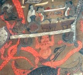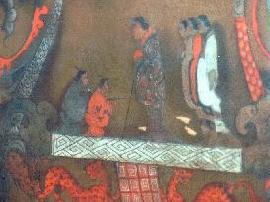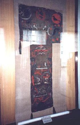 | 当時の上流社会に浸透していた死生観を表す絵画が絹の幟に描かれています。これによって漢人たちの精神世界が垣間見られます。 |