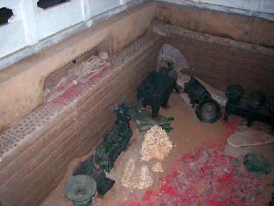 1976年、殷墟5号墓が発掘されました。この墓は殷の王室に関わるもっとも重要な墓葬です。箱形の墓坑で、墓の口は南北5.6m、東西4m、深さは7.5mの中型の墓です。随葬器物は1928件と極めて多く、青銅器は468件です。うち200件余が礼器で、そのほとんどに「婦好」、「司母辛」の銘文があり、武丁の妃・婦好の墓と判明しました。墓の底や殉死者の下には、朱砂が撒かれています。