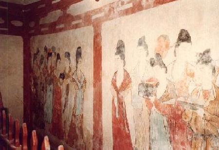 17の陪塚のうち、永泰公主など5つの墓は発掘され、その出土品が乾陵博物館に展示されています。永泰公主の墓で見つかった壁画には華やかな唐代の宮廷化活をしのばせるものがあり、奈良の高松塚古墳壁画のモデルともいわれています。