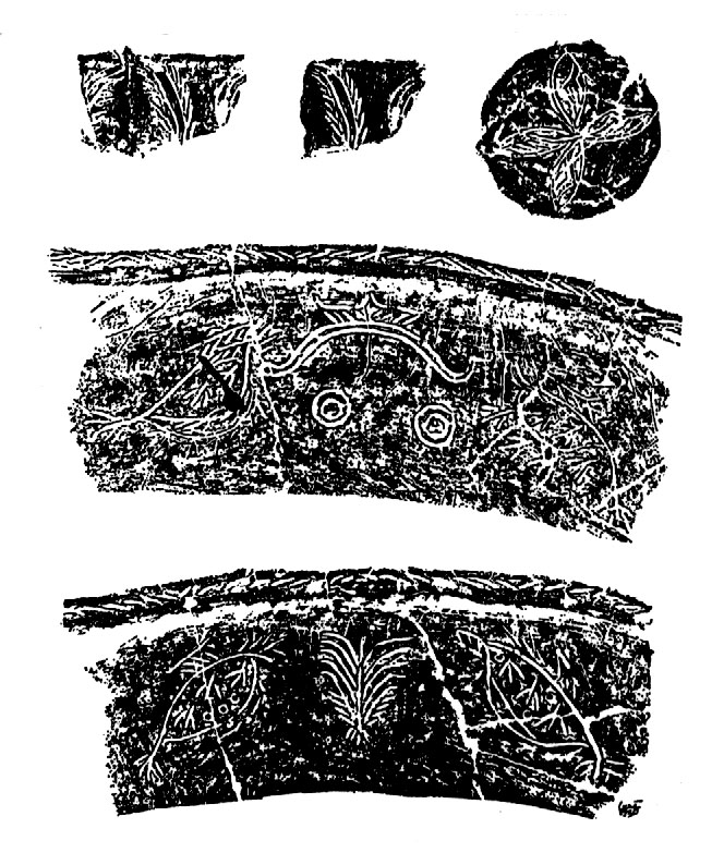 早期(3・4層 B.C.5000〜B.C.4000)は、馬家浜文化羅家角類型と近似し、陶器は簡単でほとんどが夾炭黒陶です。そして、縄紋・幾何学図案と動植物図案の刻画が見られます。