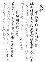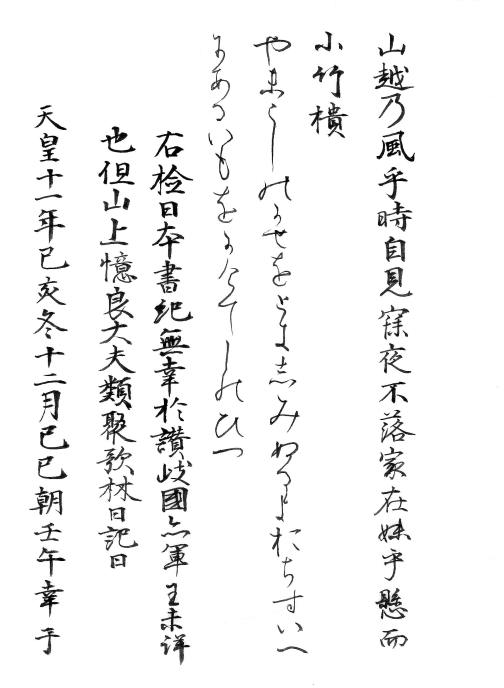 この懐紙は右近衛権少将在任中26歳の作品で、老成の趣を示し円熟した字を書いている。誠に感嘆するばかりである。同賦とあるのは詩歌会の席上で同じ題でよんだものである。懐紙とは懐中の用紙のことで当時男は普通陸奥紙を、女は色紙をふところに持っていて、詩歌の会合の席上その紙を取り出して書いたものである。現存する詩懐紙としては最古の遺品で貴重なものである。晋の王羲之の風をはなれ、温雅で流麗な和様独自の境地を開かれた。(高松市