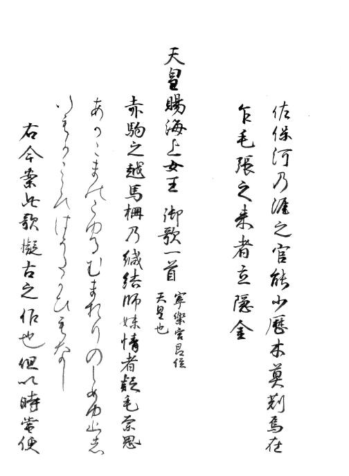 従って帰化人書道につぐわが国の書道は皇室を中心とした宮廷書道時代ということになり、またこれを代表せるものとして聖武天皇を挙げねばならぬのである。聖武天皇の能書については、当時第一と称せられたが、今その書蹟として伝わるものに正倉院御物の宸翰雑集及び同御物の銅板勅書がある。その他、宸筆と伝えているものに賢愚経がある。