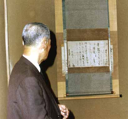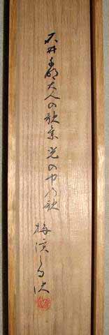 | 書家。日展参与。明治20年千葉県に生まれる。本名は董、梅渓と号す。古筆の鑑賞を田中親美に学ぶ。20世紀に輝いた日本書道の巨匠106人の一人。日展・東方書道院・書道同文会等で活躍。東京学芸大学講師、富士見高校校長を勤めた。 私は学生時代に梅渓先生のお宅を訪ね、古筆を拝見する機会を得ました。写真はその時のものです。 署名はなく、朱文の「董」の落款印が押されている。 |