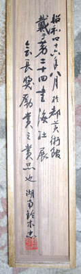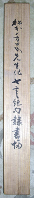 | 1893年(明治26年)1月29日、愛媛県越智郡伯方島に生まれる。16歳で上京、明治薬學校卒業。傍ら書法を加藤芳雲、近藤雪竹、日下部鳴鶴の諸先生に学ぶ。 大正10年、書海社を創立し機関誌を発行して書道の普及に尽痒する。篆・隷・楷・行・草・仮名すべての体に長じたが、大正11年29歳で平和博覧会併催の書道展に紺紙金泥の細楷正気歌で金賞を受賞して以来、「楷書の芳翠」と世に名を馳せた。その楷書は欧陽詢の九成宮をベースに、晩年は北魏の鄭道昭を取り入れ、方にして円、背勢にして向勢、秀麗端正な中に高い完成度を示し、一世を風靡した。また、行書の格調の高さを、かつてある人は「昭和の文徴明」と評した。草書は書譜をベースとして華麗である。書論では、書譜における「節筆論」で知られる。漢詩もよくした。 昭和3年戊辰書道会を創立、昭和6年には泰東書道院の創立に尽力し、昭和6年新たに東方書道会を興した。 戦後は日展審査員となり、昭和29年芸術選奨文部大臣賞、昭和34年日本芸術院賞を受賞、昭和46年日本芸術院会員に推された。財団法人書海社理事長、日展参与。著書に『書道入門』『臨池六十年』などがある。 1971年(昭和46年)12月16日、歿する。79歳。 私は大学卒業後、しばらくの間、財団法人書海社に勤務し、直接ご指導を賜った。 この作品は第20回記念展で鈴木湖南氏が会長奨励賞を受賞した時の賞品で、ご本人の箱書きがある。 |