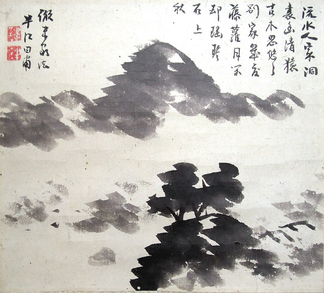 | 米山人の子。名は粛、字は子羽、号は半江・子米・無声・寒山・独松楼・寒山外史・墨江老樵など。通称宇左衛門、父の没後は彦兵衛を襲名した。 父に代わり家業の米穀商に精励、よく繁盛させた。画を父に習い、また南宋・元・明の画跡を研修し、一家を成した。山水・花卉画を得意とし、詩文にも長じていた。伊勢国津藩藤堂家に仕えた。天保3年ごろ職を辞し、子の寸庵(彼も画人として活躍)に米穀商の家督を譲り天満橋北に隠居所を構えたが、父米山人が残した膨大な量の書画や書籍が天保8年(1837)大塩の乱の煽りで、灰燼に帰している。 半江が本格的に絵筆を振るい始めたのはこの事件以降のことである。居を住吉に移し、父の知友であった 篠崎小竹、田能村竹田など多くの文人と親交を結んだ。 「倣米家法」とある。「米法」を真似たもので、輪郭線で表現することの多い米山人・半江親子の技法とは全く異なる技法で書いたもの。珍品といえる。 「半江田粛」の左に、共に白文の「粛印」「半江」の落款印が押されている。 推奨サイト http://fine-vn.com/cat_13/ent_71.html http://www12.plala.or.jp/HOUJI/bunkajin-haka/newpage391.htm http://www.tulips.tsukuba.ac.jp/jart/mokuji/2odhk001.html http://www.shibunkaku.co.jp/biography/search_biography_aiu.php?key=o&s=240 http://plaza.rakuten.co.jp/kohionagasu46/diary/200705290000/ 「米法山水」 中国宋代の文人画家米芾友仁父子がはじめたと伝えられる水墨山水画法。輪郭線を用いず、山の大体の形や木の枝幹を墨の暈し(ぼかし)でつくり、その上に墨の点を重ねてかき上げる方法で、この墨の点描を米点と呼ぶ。唐代の潑墨山水、粗放な型の画風の創始者の1人王黙に源をもつといわれるが、後世ではきわめて瀟洒なものになった反面、整いすぎて形式化したものが少なくない。(世界大百科事典 平凡社 川上歴) |