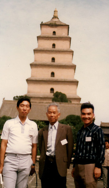 | 福島県郡山市湖南町福良弥陀内に生まれる。本名は喜八、巨流と号し、別に無九庵主人と号す。昭和23年、書を近藤秋篁、南画を平原香雪に学ぶ。中央大学法学部卒。 (財)書壇院顧問、書壇院展総務・審査会員、書道研究西林会代表、東京都職員文化会書道部賛助会会長を務めた。著に『無九庵雑記』(H16)がある。 私は昭和53年、全日本書道連盟の第9次日本書道使節団(団長 金子鴎亭先生)の一員として結城先生とご一緒した。大学の先輩でもあり、近藤秋篁先生に師事を勧めた神田・温恭堂のご主人は高校の先輩で、私自身が谷村先生の稽古で温恭堂に通っていました。 左の写真は平成4年のものだそうで、奥様のミユキ様より提供頂きました。右の写真は日本書道使節団で訪中した折の大雁塔での写真で、右から巨流先生・中央が内藤香石先生・左が私です。 |